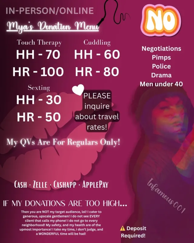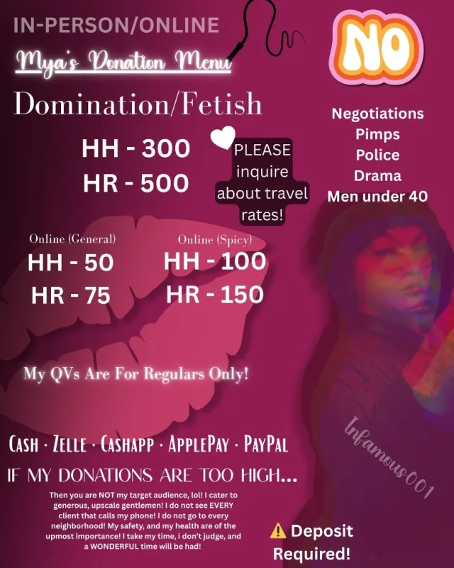 X: @BFineee222 Snap: TheeInfamous001 NO ONE UNDER 35 APPROACH APPROPRIATELY! CA: $infamousmya I do have Zelle, ApplePay, Come play 🥳😈 Kinks I Favor: Abrasion Animal play (dressing or playing as, no real animals involved) ⭐ CBT (cock ball torture) Chastity ⭐ Face sitting ⭐ Foot fetish / worship Hard sports (give) Human ashtray ⭐ OTK (Over the knee spanking) Ponyboy / Ponygirl Pup play PVC ⭐ Raceplay/BNWO Role-playing Role reversal (strap-on) Rubber Sensory deprivation Spanking Tease and denial Tie and tease training ⭐ Verbal humiliation (give) ⭐ Water sports - giving Wax play Whips and paddles Will entertain couples Fantasy outfits (on request) Girlfriend experience (GFE) Lunch / dinner dates Prostate massage Service by two providers Toy show Travel / extended dates Will entertain women I CAN DO OUTCALLS EVERY WHERE JUST ASK!!